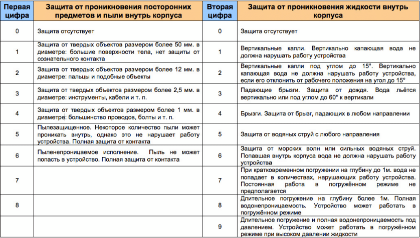 - Y – защита от попадания влаги, диапазон от 0 до 8 («0» – защиты нет, «8» – штатно работает при длительном нахождении под водой).