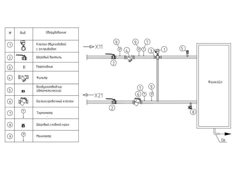 Узел обвязки устанавливается с целью управления холодопроизводительностью путем регулировки подачи теплоносителя и его балансировки. Из-за большого разнообразия подобных узлов правильный монтаж фанкойла в разных помещениях может иметь определенные отличия. Он зависит от сложности все системы кондиционирования, возможностей объекта и требований, которые предъявляются к микроклимату. Каждый производитель предлагает собственную схему обвязки и, соответственно, комплектующие для нее собственного производства.