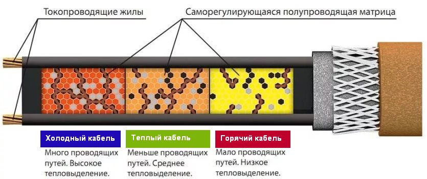 Саморегулирующийся кабель. Нагревательный элемент данного типа кабеля расположен между токопроводящими жилами по всей длине. В основе нагревательного вещества лежит полупроводник с положительным температурным коэффициентом (PTC). Чем сильнее прогревается кабель и окружающее его пространство, тем меньше тепла он выделяет. Тем самым провод сильнее “жарит” холодный пол и “еле греет” уже прогретый. Отличительной чертой данного типа является наличие моделей, мощностью до 60+ ватт на погонный метр. Мощность является начальной, когда пол холодный, при нагревании мощность падает.