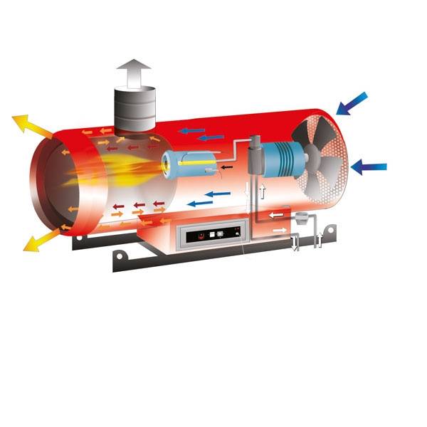 Вторые имеют изолированную камеру сгорания и предназначены для установки в специальных помещениях с дымоотводящей системой. Они выпускаются производителями в двух вариантах: как напольное или подвесное оборудование. Второй тип конструкции именуется калориферным, то есть выполняющим функцию обогрева только одного помещения.