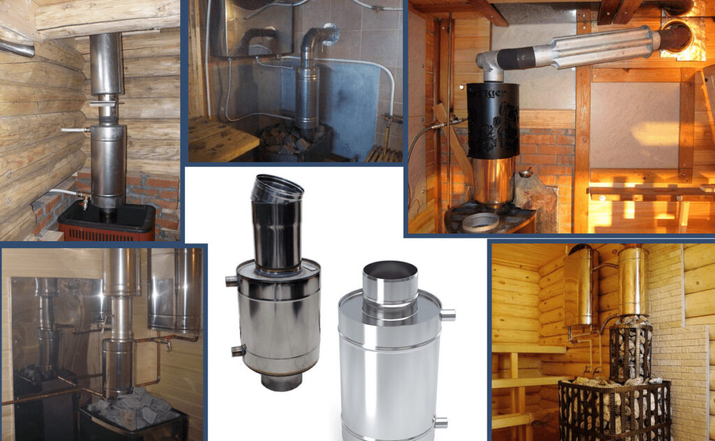 Отдельная разновидность теплообменников для печи применима для бани в качестве элемента дымохода. Расход тепла от сгорания топлива в таких приборах происходит более рационально. Основную тепловую энергию, которая идет для нагрева парилки, теплообменник, встроенный в печь, поглощает от топки печи. А вот устройство самоварного типа (то есть на трубе), чтобы нагреть воду использует тепло дымоходной трубы. В результате его эффективность высока.