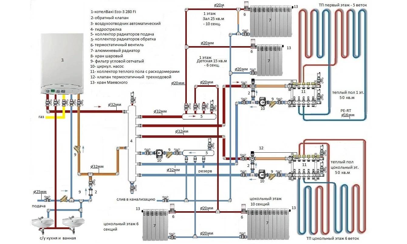 Схема, иллюстрирующая систему отопления частного дома