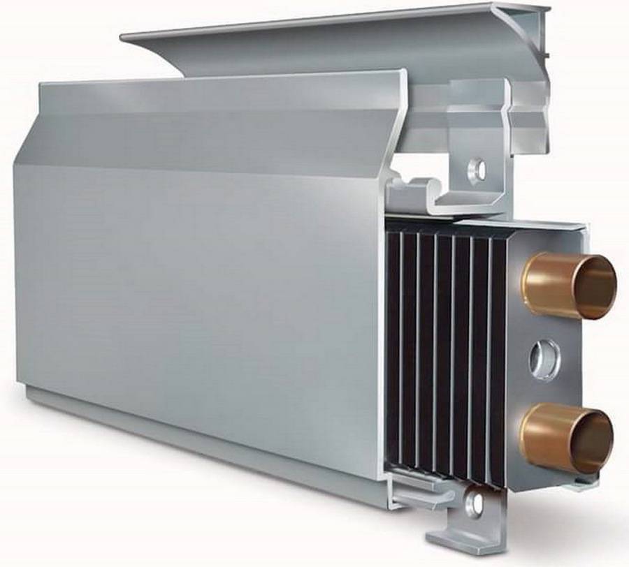 Конструкция подобной системы включает алюминиевые анодированные ламели, благодаря которым обеспечивается сильный прогрев стен и ближайших поверхностей. За счёт установки подобных плинтусов возникает эффективная завеса, которая отлично защищает помещение от холодного воздуха.