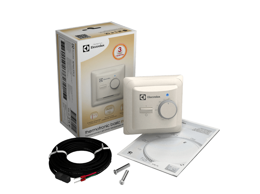 Electrolux Termotronic Basic – терморегулятор Электролюкс для теплого пола отличается универсальностью, управляется механическим способом. Мощность прибора 5 Вт, он обеспечивает диапазон температур от +5°С до +40°С.