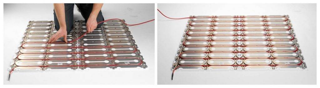 Чтобы облегчить работу по укладке магистрали на деревянную поверхность, используют уже готовые контуры и металлические теплообменные пластины, которые отсоединяют от общего полотна руками, без каких-либо приспособлений; в местах разрыва на полотне предусмотрены пунктирные линии.
