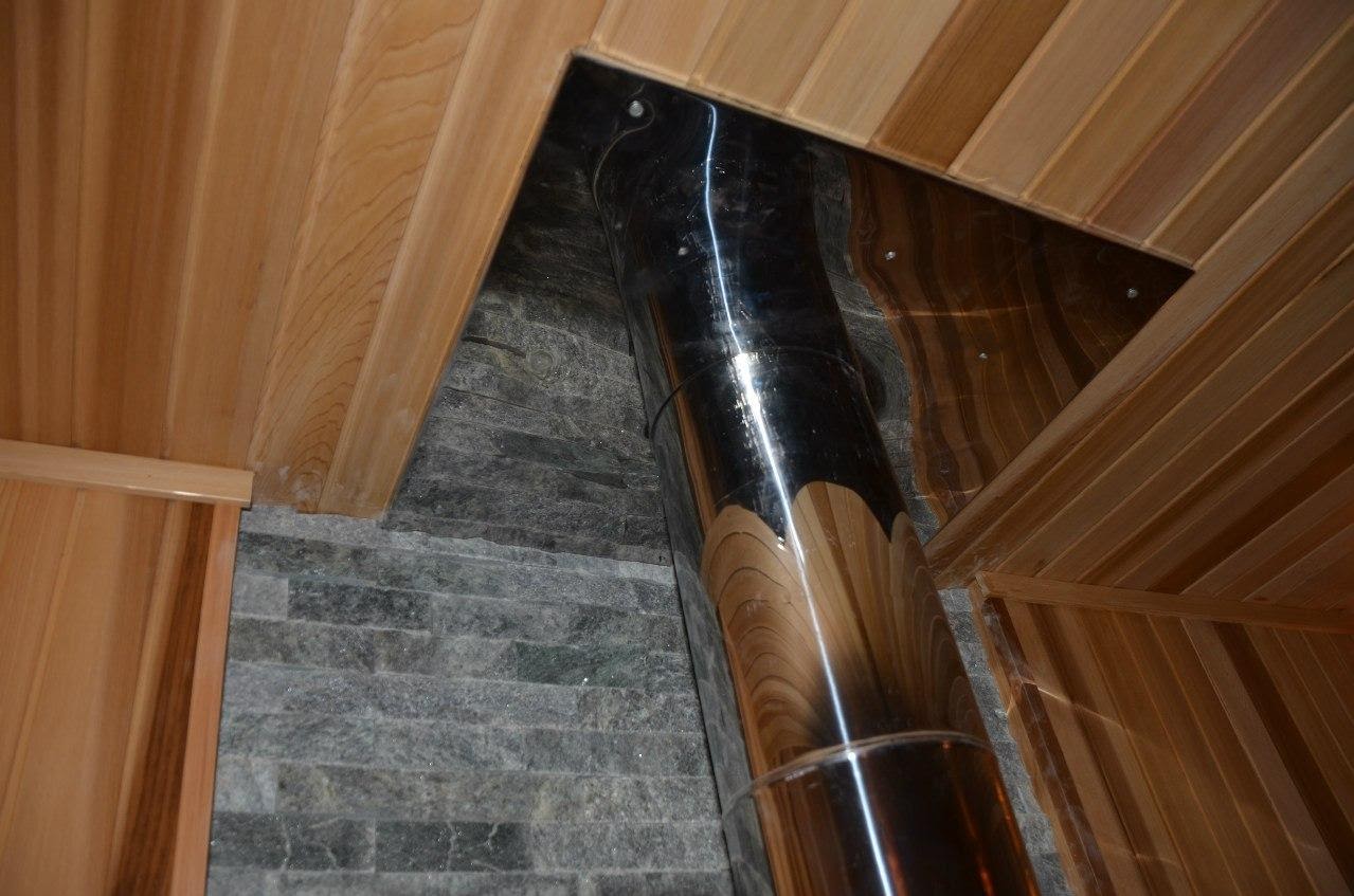 Обдумывая, как установить трубу в бане через потолок, обязательно уделите внимание такому немаловажному фактору, как выбор подходящего места для прохода перекрытия для дымохода. Основная функция переходника — защита от возгорания