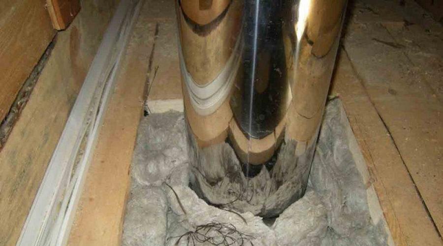 — материал, выбранный для термоизоляции прохода трубы через потолок бани;