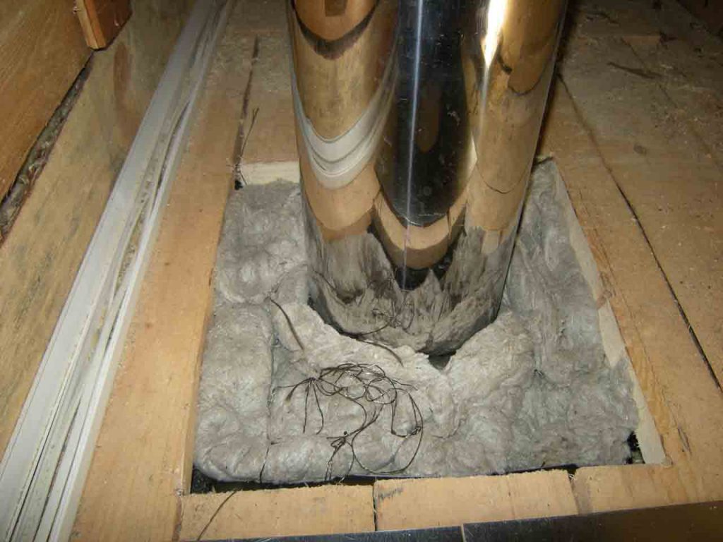 Он состоит из фольги в два слоя и теплоизолятора. Изоляция помогает кровле и деревянному перекрытию получить защиту от перегрева и возгорания. Выход трубы в зоне потолка и кровли рекомендуется изолировать асбестовыми листами. Внутрь короба засыпают керамзит, который послужит деревянному перекрытию хорошей защитой от возгорания. Рекомендуется перед началом работ по изоляции трубы дымохода из металла, ее наружную часть обработать жаростойким герметиком.