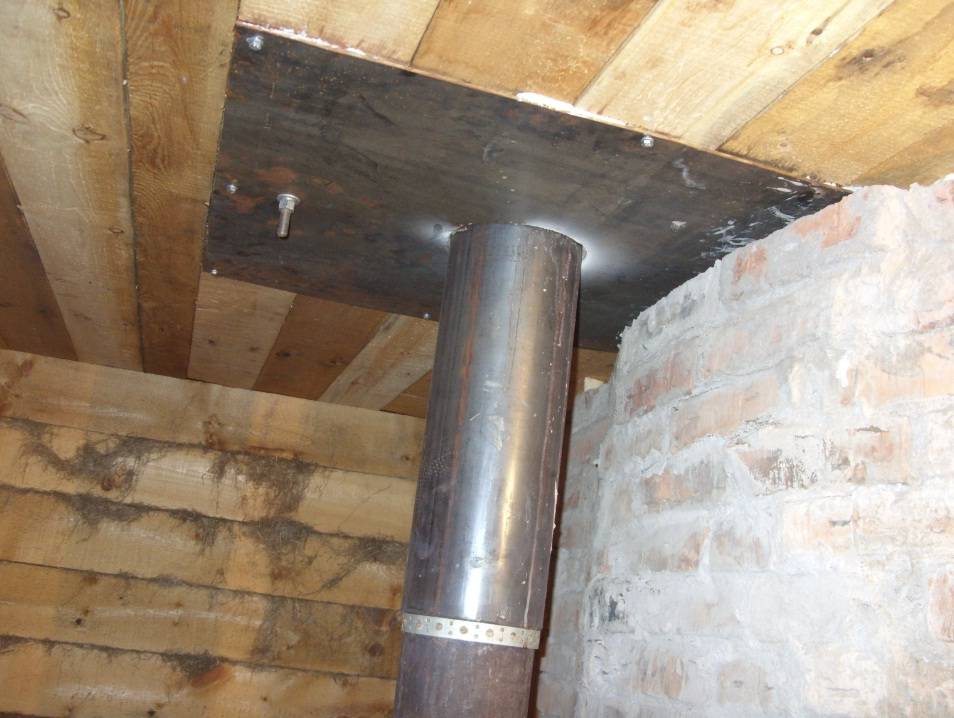 Можно осуществить проведение дымохода через потолок в бане и без заводских узлов.