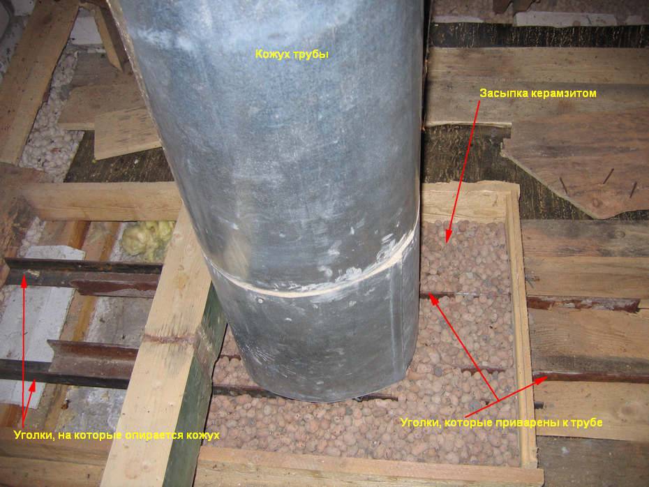Изоляция помогает кровле и деревянному перекрытию получить защиту от перегрева и возгорания. Выход трубы в зоне потолка и кровли рекомендуется изолировать асбестовыми листами. Внутрь короба засыпают керамзит, который послужит деревянному перекрытию хорошей защитой от возгорания. Рекомендуется перед началом работ по изоляции трубы дымохода из металла, ее наружную часть обработать жаростойким герметиком