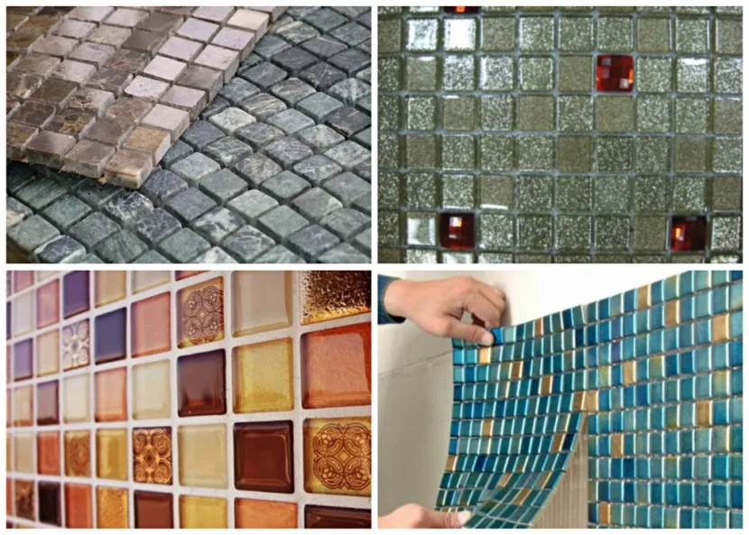 Мозаика для облицовочных работ выделяют в отдельную группу из-за совсем маленьких размеров от 1 до 5 см. Как правило, в продажу поступают готовые сборные полотна на сетке. Стекло, керамика или керамогранит могут быть толщиной от 2 до 12 мм.