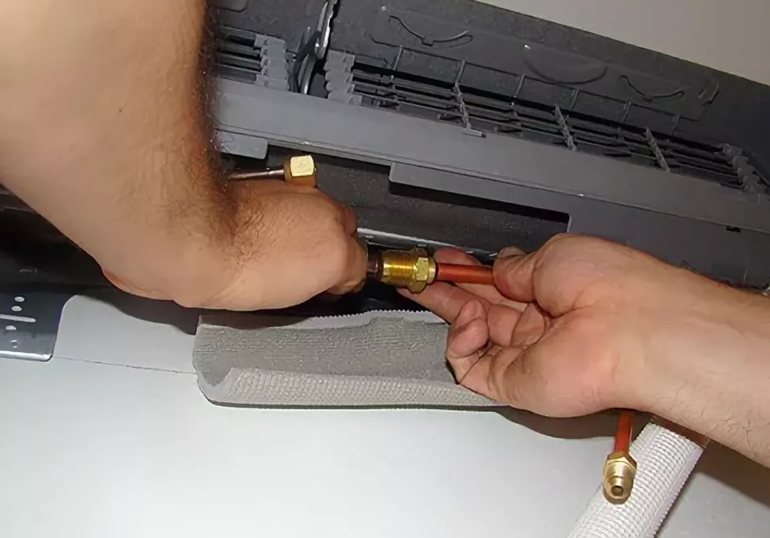 Сперва трубки подключаются к внутреннему блоку. На его боковой стенке имеется два порта со штуцерами разных диаметров. С них нужно скрутить гайки. В результате этого появится шипение, свидетельствующее о том, что из блока выходит азот, который был закачан производителем. Он необходим для защиты внутренних деталей от окислительных процессов.