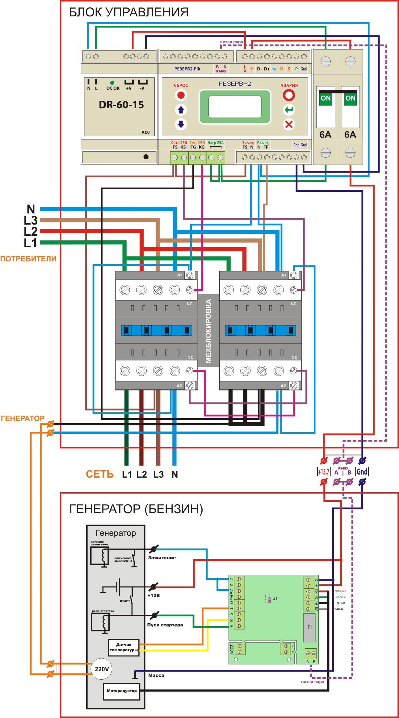 Нужна электрическая схема, отслеживающая напряжение электроснабжения, которая запустит генератор, выведет его на нужные обороты и переключит рубильник. Подобные устройства, осуществляющие автоматический ввод резерва (сокращенно АВР ) выпускаются промышленностью. Подробная схема подключения прилагается к устройству, но принцип подключения можно понять, изучив рисунок ниже: