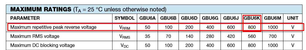 Этому параметру также следует уделять внимание, когда вы будете выпрямлять сетевое напряжение. Если вы будете подавать на диодный мост 220 Вольт, то его пиковое значение будет составлять 310 Вольт (220 × √2). Так как у меня диодный мост GBU6K, то надо смотреть табличку ниже