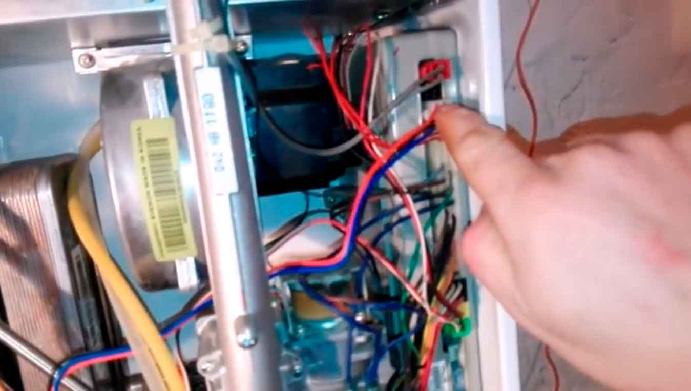 - Вставляем провод от насоса в оставшийся разъем, подключаем трубу на выход воды снизу котла и все должно работать.