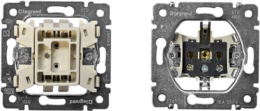 Чтобы не полагаться на наличие или отсутствие стрелочек на клавишах, нужно осмотреть контактную часть. На фирменных изделиях должна быть нанесена схема, позволяющая понять, какого типа оборудование у вас в руках. Она точно есть на изделиях фирм Lezard (Лезард), Legrand (Легранд), Viko (Вико). На китайских экземплярах они часто отсутствуют.