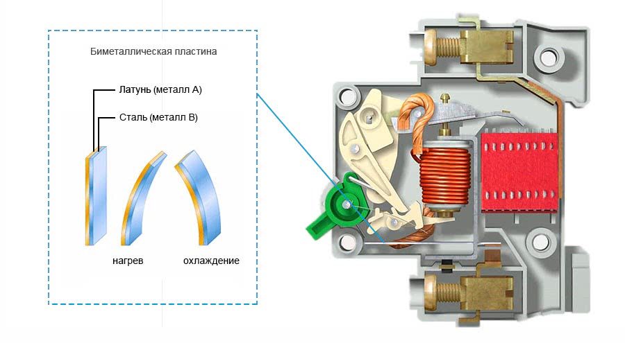 Тепловой расцепитель представляет из себя биметаллическую пластину. Биметаллическая пластина — эта пластина спаянная из двух пластин различных металлов (металл «А» и металл «В» на рисунке ниже) имеющих разный коэффициент расширения при нагреве.
