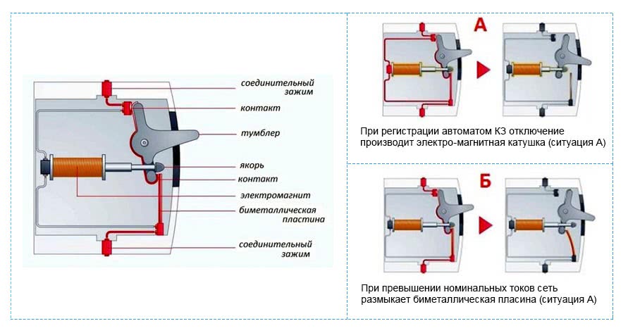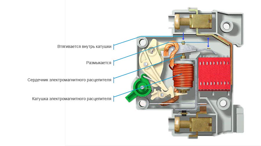 При коротком замыкании (т.е. при мгновенном возрастании тока в несколько раз) электромагнитный расцепитель отключает электрическую цепь за доли секунды.