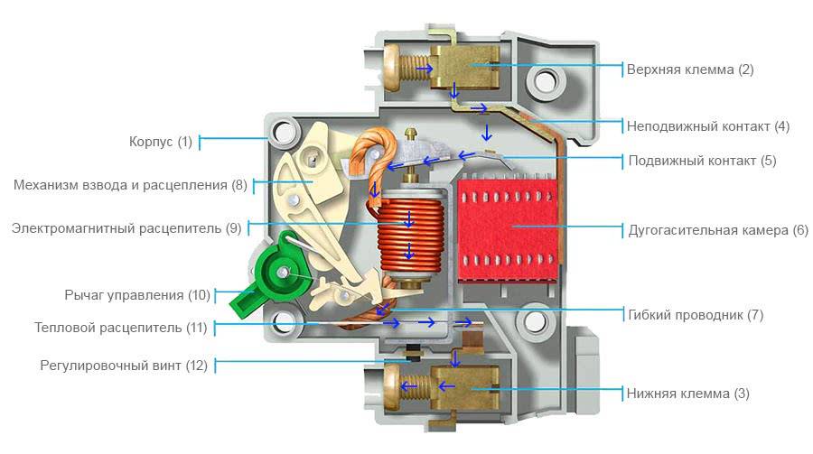 Синими стрелками на рисунке показано направление протекания тока через автоматический выключатель.