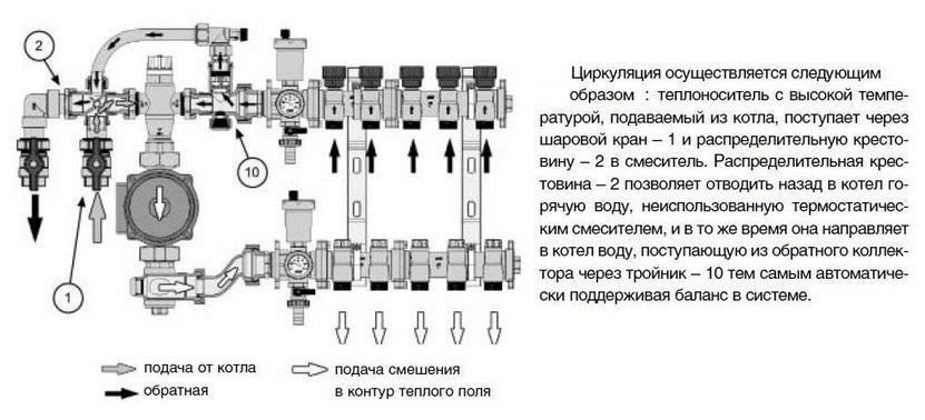 - Управление работой системы выполняется при помощи термостатов, узла смешивания и термостатических клапанов. Они все ставятся на коллекторном блоке, он является основным узлом управления.