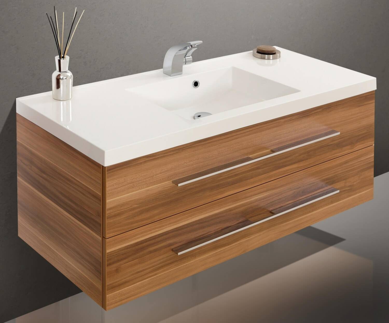 Подвесной шкаф с раковиной для ванной комнаты – вариант на редкость эффектный. Тумба укрепляет на стену, дистанция от пола не менее 15 см. Выглядит мебель изящной и легкой вне зависимости от размеров. Консольная тумба облегчает уборку, так как не соприкасается с полом.