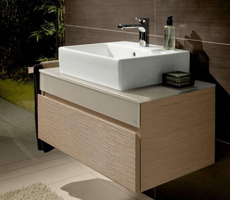 Раковина со столешницей и без полностью заменяет собой верхний горизонт тумбы. При небольших размерах верх занимает только чаша, она буквально накладывается на корпус тумбы и опирается на нее.