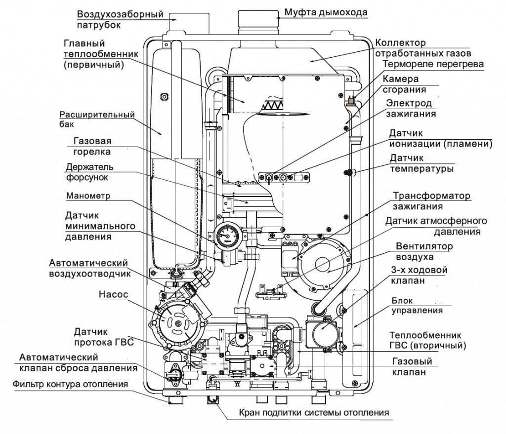 - В котле есть два теплообменника – первичный и вторичный. Первый используется для нагрева воды в системе отопления, второй – для системы горячего водоснабжения;
