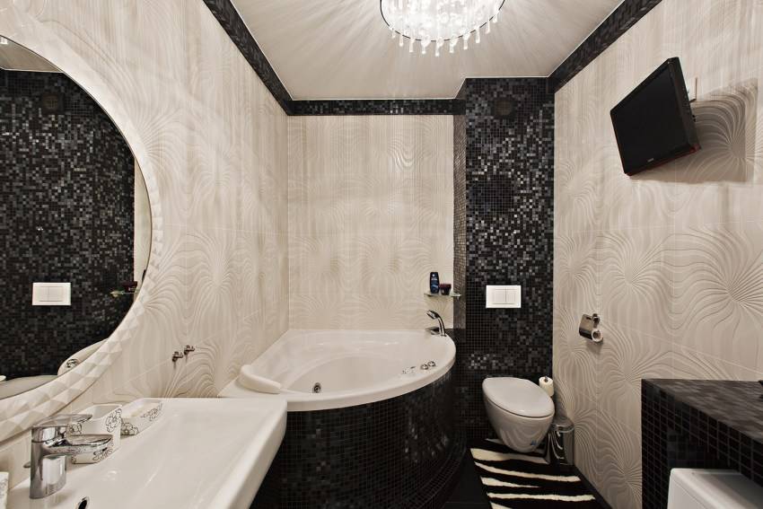 Восточные стили питают особую любовь к мозаикам, а также полукруглым формам. Очень эффектно в этом случае будут смотреться панели для ванной с характерными восточному стилю принтами. Ванну можно обложить плиткой пастельных и бежевых тонов, добавить в интерьер побольше бирюзового и золотистого.