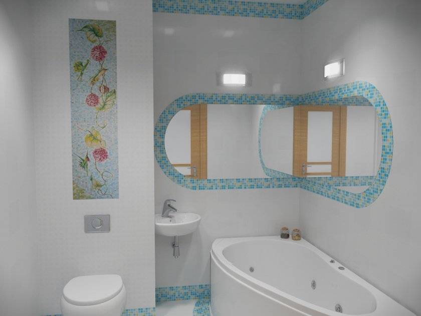Фасады мебели в тон белой угловой ванне и отделке стенИсточник static.azbukasantehniki.ru