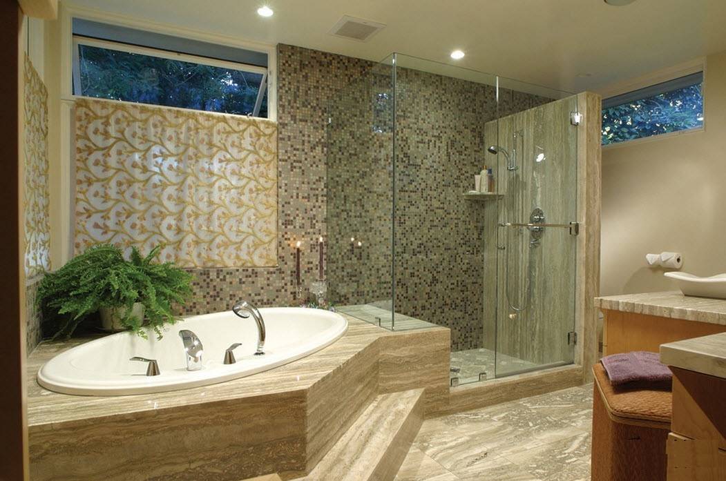 Очень впечатляюще смотрится купель, расположенная на подиуме. Такой дизайн замечателен для ампира или классики. Японский стиль предусматривает горячие источники. Создать этот необычный дизайн вполне реально – установить на подиум полукруглую джакузи.