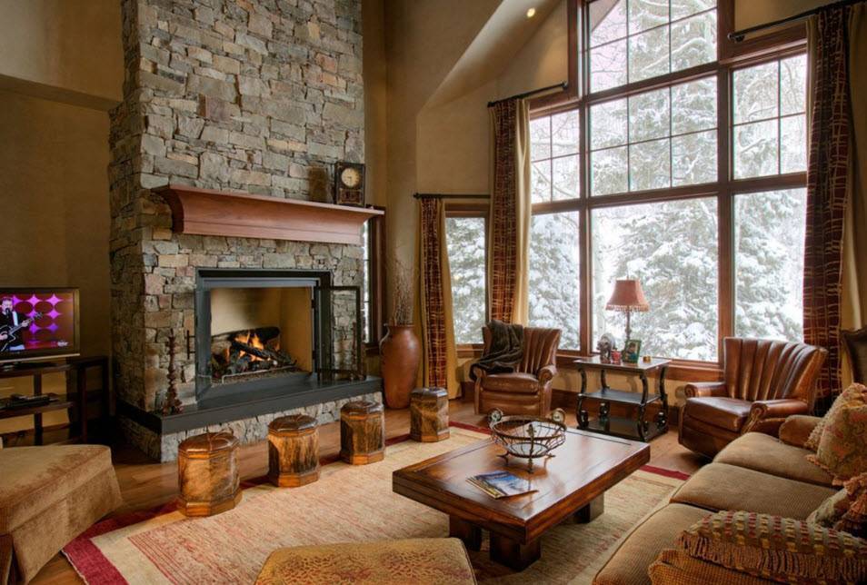 - Если в гостиной есть панорамные окна, то камин можно расположить между ними, что позволит объединить окна, сделав оформление максимально природным и привлекательным.