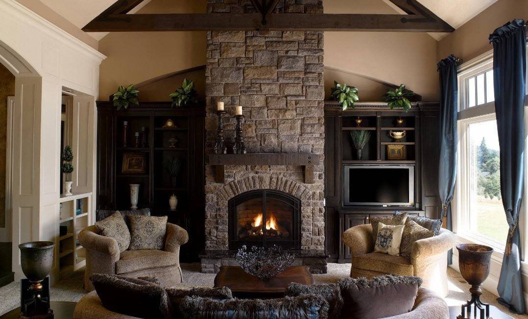Камины в стиле рустик напоминают русскую печь – топка прямоугольной или арочной формы обрамлена кирпичной или каменной отделкой, под ней часто располагается дровница, а боковые стороны плавно переходят в полки. Общий вид спереди напоминает букву «Д». Для отделки таких каминов используют натуральные материалы или их имитацию: камень, клинкерная плитка, металлический декор – все эти материалы отлично сочетаются с деревянной отделкой дома. Верхнюю полку и боковые полочки из резного дерева украшают домашней утварью в деревенском стиле. Благодаря такому оформлению гостиная приобретает уютный вид, стилизованный под загородный дом.
