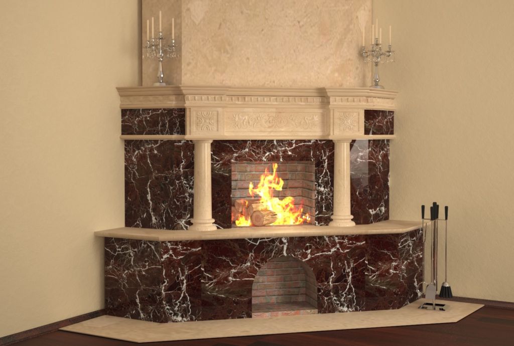 Более пышными можно назвать классические камины в стиле ампир, рококо или барокко. Их особенность – обилие элементов декора. Угловые камины в стиле ампир украшают элементы, свойственные эпохе расцвета римской классической культуры: колонны и консоли, декор в виде скульптур людей или мифических животных, венки и гирлянды. В декор часто вписывают зеркало, придающее величественность.