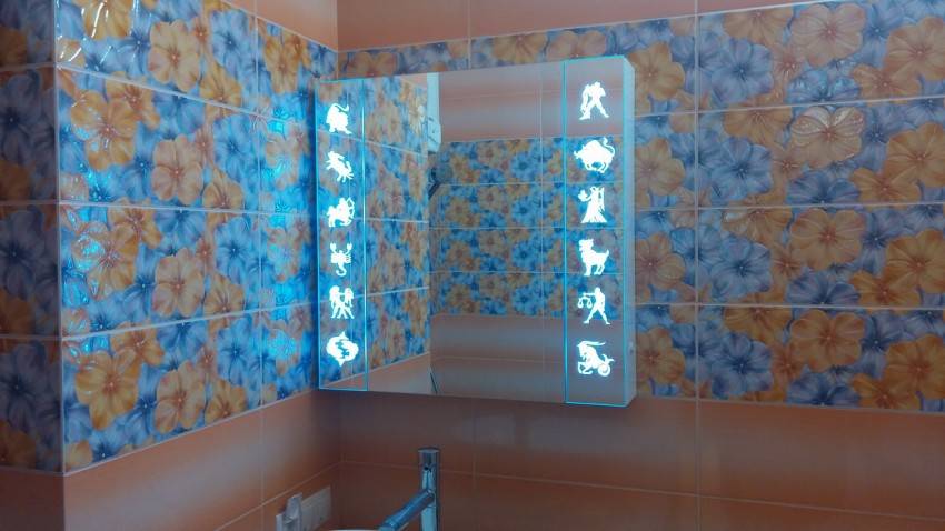 - Подсветку. Она создается возле встроенного в двери зеркала и позволяет удобнее наносить макияж или снимать его перед сном.