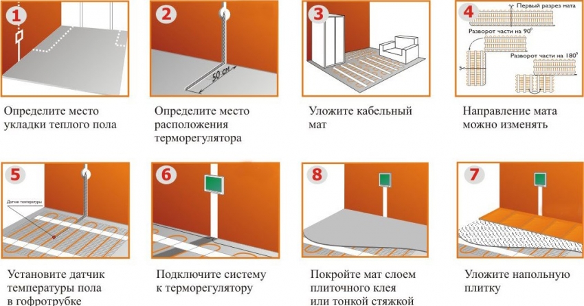 Обустройство нагревательных элементов будет обусловлено разновидностью пола и дальше надлежит придерживаться инструкции.