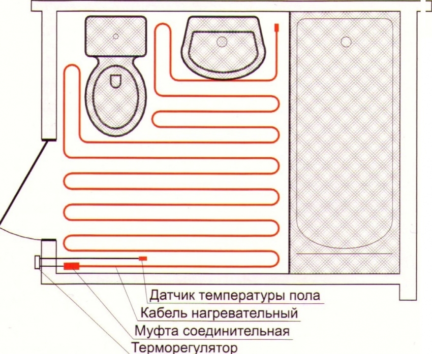 Схема расположения элементов системы теплого пола в ванной комнате стандартного размера