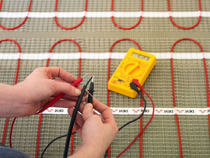 Производится тестовый запуск. Это необходимая мера, ее реализуют перед заливкой конструкции бетонным раствором. Если есть дефекты в нагревательных элементах или некоторые участки системы не функционируют, проще выполнить ремонт при отсутствии бетонного слоя сверху. Чтобы включение после укладки плитки не принесло сюрпризов, рекомендуется тестировать работу нагревательных элементов на протяжении нескольких часов.