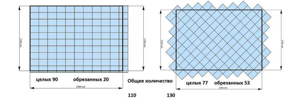 При одной и той же площади, количество плитки зависит от способа раскладки