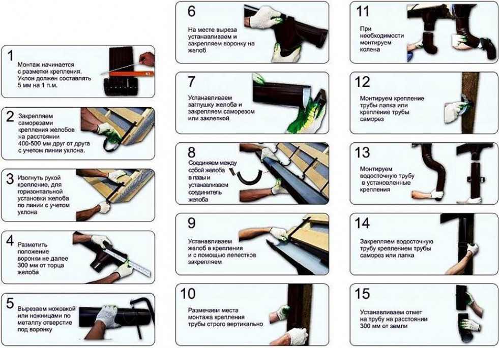 Не выдержан интервал между кронштейнами. Расстояние между держателями пластиковой конструкции задается до 0,9 см; если система металлическая, его можно увеличить до 1,2-1,5 м. Следствием увеличения этих размеров также станет вероятная деформация, застаивание и намерзание льда.