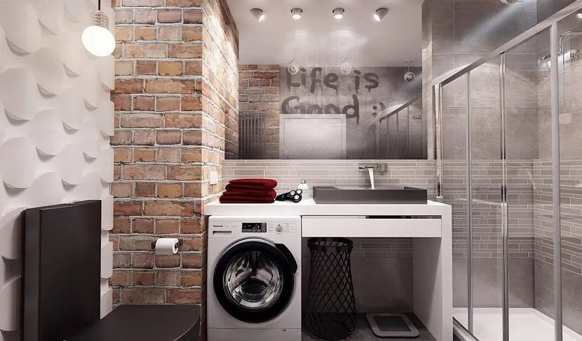 Кирпичная кладка с широкими швами — это главный символ лофта. Такую облицовку можно использовать частично или задействовать полностью для всех стен. Длинный и узкий душ со стеклянными раздвижными перегородками хорошо сочетается с общей обстановкой. Габаритный темный унитаз делает серьезный акцент в дизайне. Белоснежная столешница, оборудована матовым умывальником, под ней размещаются стиральная машинка и округлая корзина для белья.