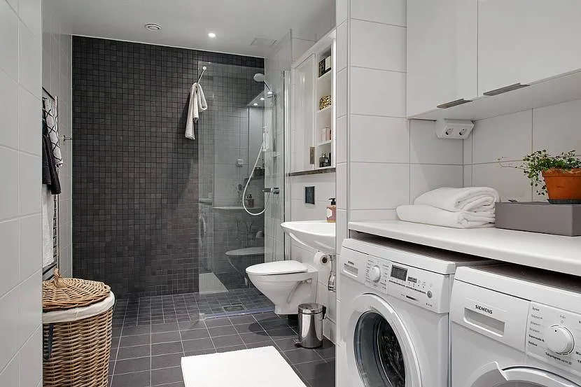 - Разделение на функциональные зоны – перегородка из стекла, в отличие от кирпича или гипсокартона, не перегружает пространство, оставляя его легким и воздушным. В то же время она является реальной преградой, разделяющей зоны, например, душевую от уборной, если это смежный санузел. Если в ванной расположена стиральная машина, сушка и гладильная доска, эту «бельевую» зону можно деликатно отгородить от остального помещения, рационально используя пространство.