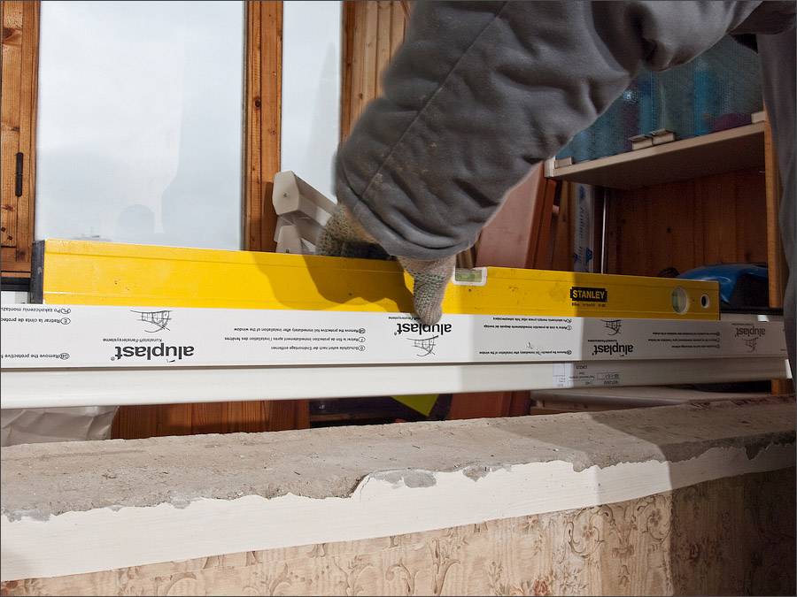 - В специальный паз, в нижней части рамы установить подоконник и выровнять его строительным уровнем.
