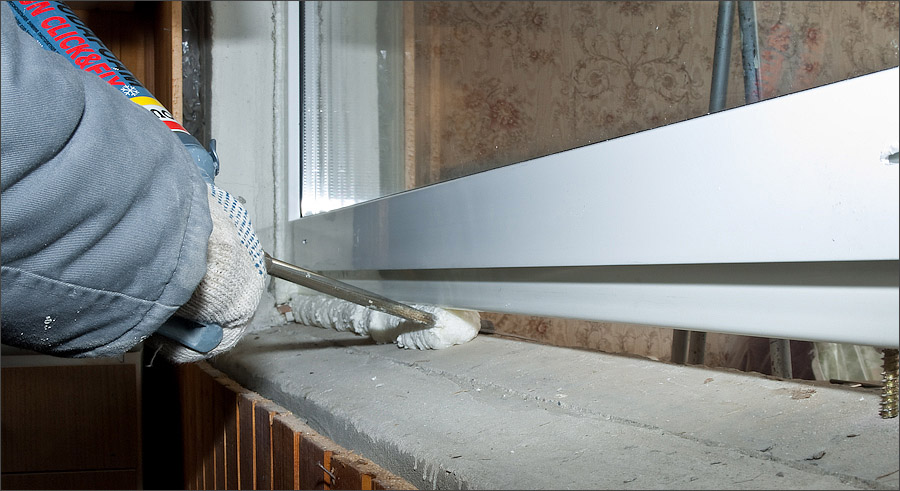 - Пустоты между подоконником и рамой заполняются герметиком, а между ним и оконным проемом – монтажной пеной.