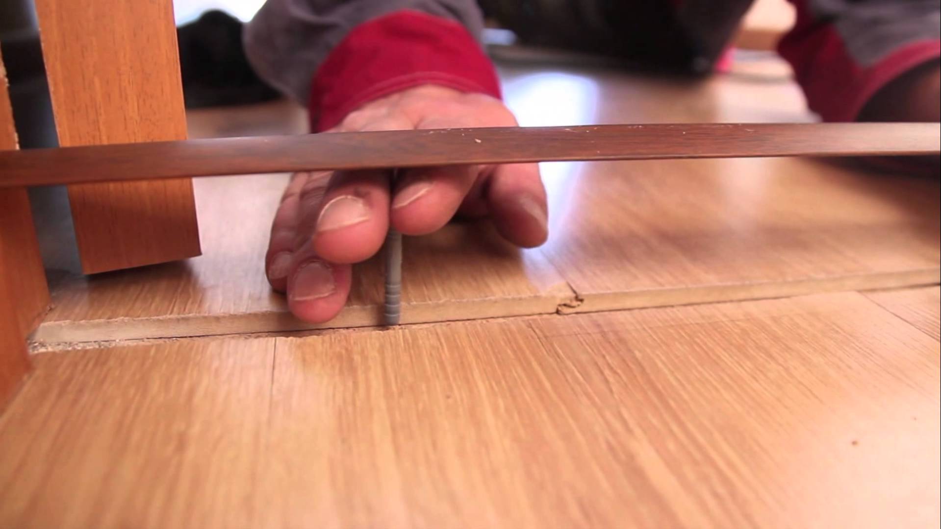 Скрытый монтаж характерен для порогов из ламината, которые представляют собой крепежную планку и верхний декоративный элемент. Скрытая от глаз планка крепится в дверном проходе на саморезы, а на нее сверху сажается путем защелкивания или приклеивания верхняя планка.