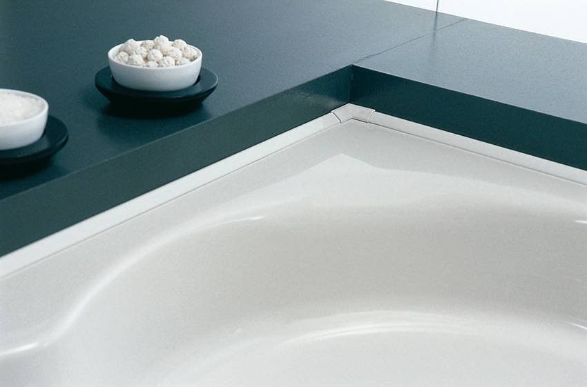 - Составные – состоят из двух деталей: декоративного уголка и крепежного элемента в виде планки. Такая модель монтируется в несколько этапов. Крепежная планка устанавливается на стену во время укладки плитки. Затем монтируется ванна, и после этого крепится декоративный уголок.