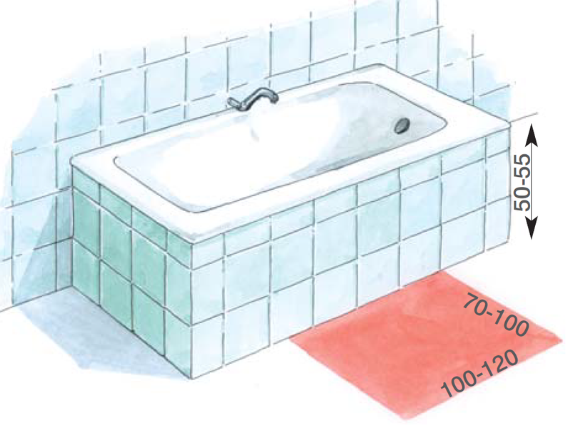 - перед ванной необходимо оставить свободное пространство 100-120х70-100 см.