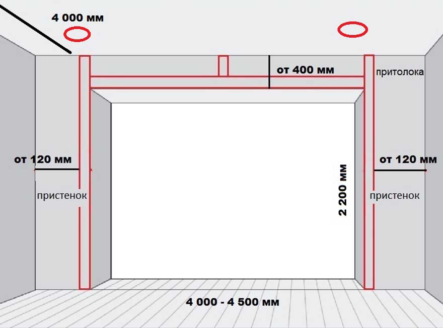 Учитывают расстояние от проема до потолка и от проема до ближайшей преграды сбоку (чаще всего – стены). Речь о притолоке и пристенках, т. к. конструкция должна занять верхнюю и боковую часть (устанавливается блок управления рядом с секционными воротами), например, минимальный размер притолоки – 10 см (для проема площадью 8 м2), но лучше предусмотреть от 15 см и больше, а пристенка – 12 см.