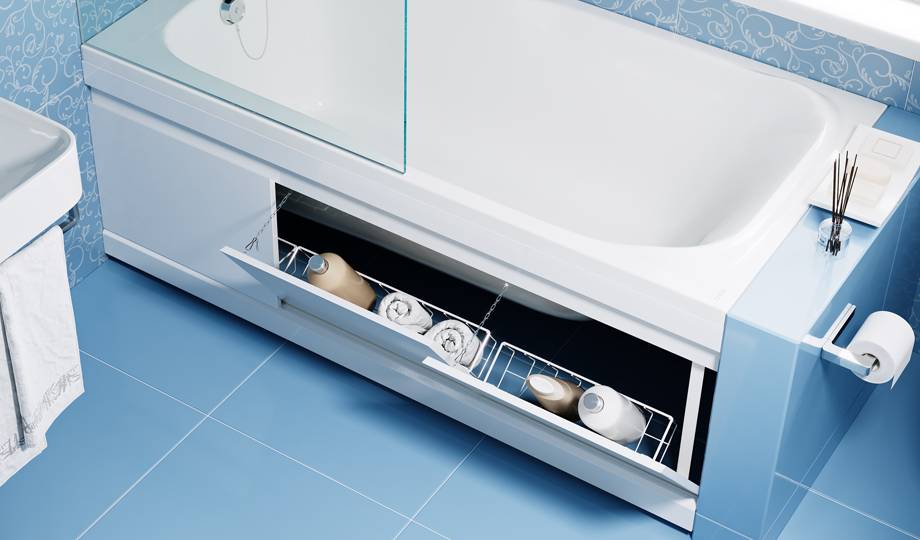 Пространство между полом и ванной закрывают устройством, которое именуют экраном. В настоящее время в строительных магазинах представлен большой ассортимент подобных приспособлений.