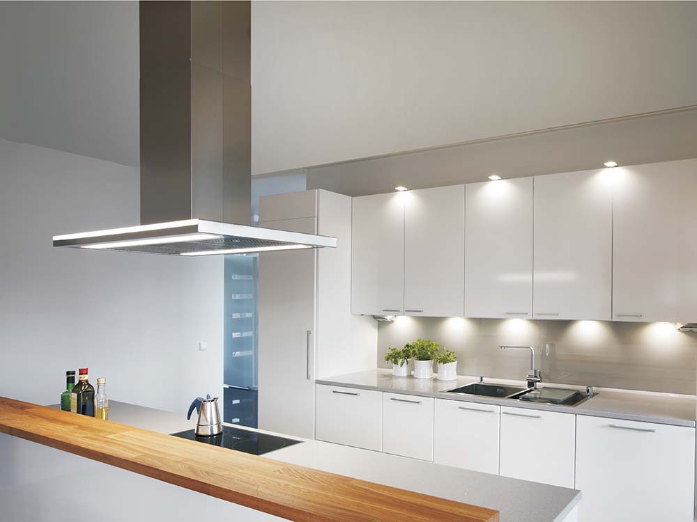 Некоторые вытяжки встраиваются в мебельные модули, другие размещаются в центре кухонного “острова”, а третьи просто крепятся к стене.