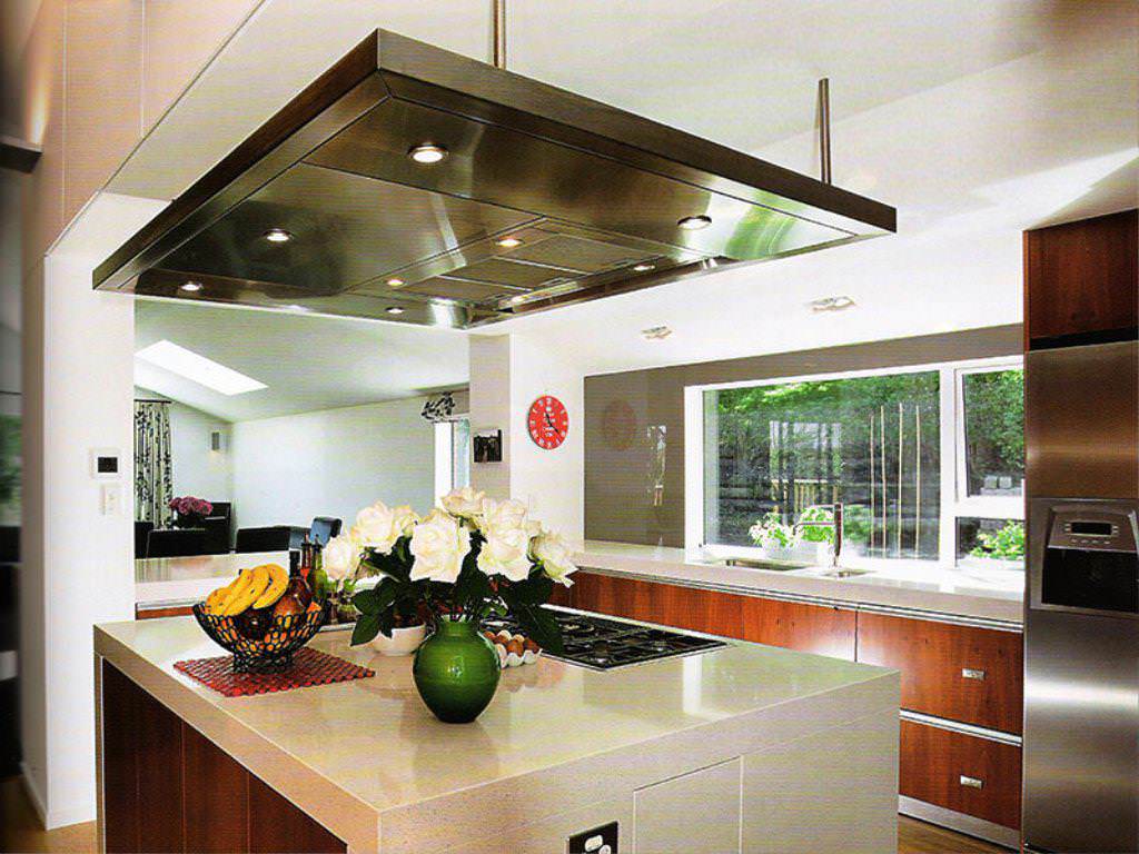 - Островные единицы. Подходит для больших кухонь с центральным расположением плиты. Вытяжка опускается над варочной поверхностью и соединяется с вентиляционной системой через квадратную трубу;